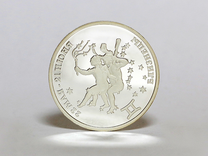 в центре – стилизованное изображение знака зодиака «Близнецы». По кругу – надписи: вверху – «22 МАЯ – 21 ИЮНЯ», внизу – «БЛИЗНЕЦЫ».