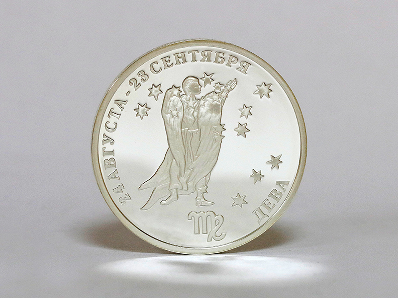 в центре – стилизованное изображение знака зодиака «Дева». По кругу – надписи: вверху – «24 АВГУСТА – 23 СЕНТЯБРЯ», внизу – «ДЕВА».