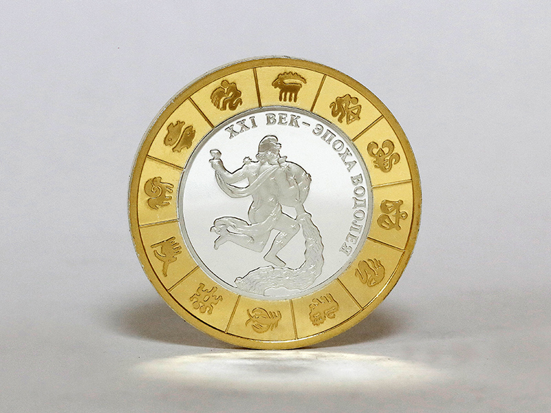в центре – обрамлённое в круг стилизованное изображение знака зодиака «Водолей», над ним по кругу – надпись: «XXI ВЕК – ЭПОХА ВОДОЛЕЯ». По окружности – секторальное изображение двенадцати знаков зодиака.