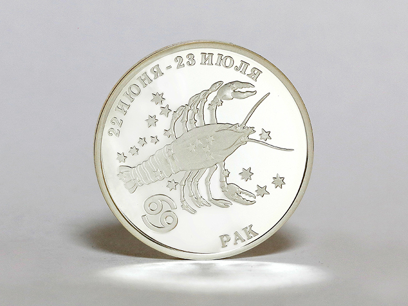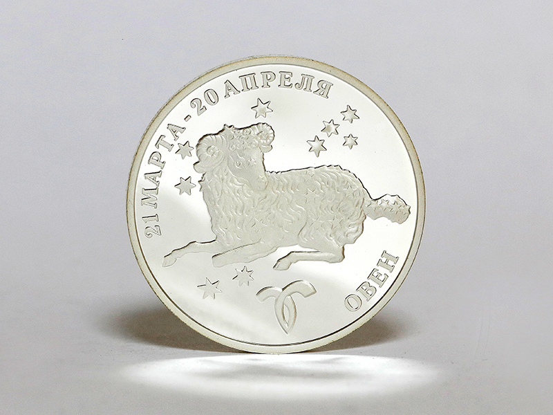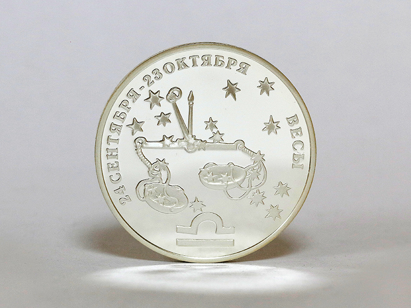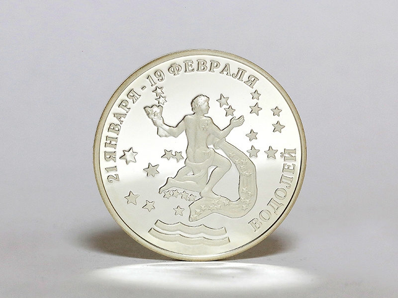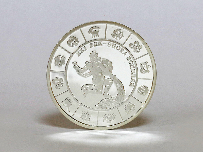 в центре – обрамлённое в круг стилизованное изображение знака зодиака «Водолей», над ним по кругу – надпись: «XXI ВЕК – ЭПОХА ВОДОЛЕЯ». По окружности – секторальное изображение двенадцати знаков зодиака, выполненное в позолоте.