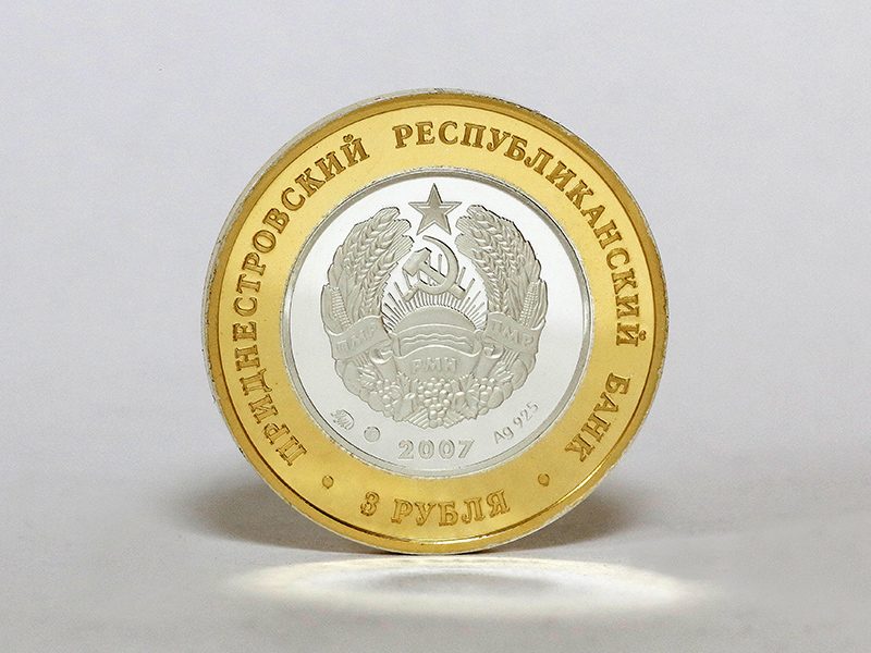 в центре – изображение Государственного герба Приднестровской Молдавской Республики; по кругу – надписи: вверху – «ПРИДНЕСТРОВСКИЙ РЕСПУБЛИКАНСКИЙ БАНК», внизу – «3 РУБЛЯ» (поле монеты, на котором размещены данные надписи, позолочено). В нижней части под гербом – год выпуска монеты «2007», слева – логотип изготовителя, государственное пробирное клеймо, справа – обозначение металла, проба сплава.