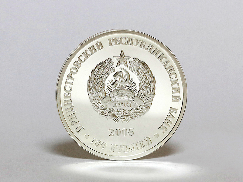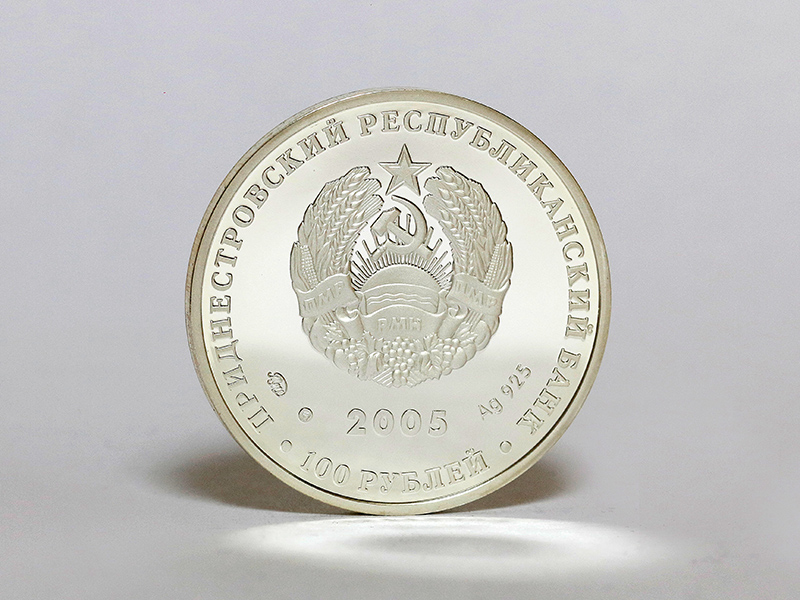 в центре – изображение Государственного герба Приднестровской Молдавской Республики; по кругу – надписи: вверху – «ПРИДНЕСТРОВСКИЙ РЕСПУБЛИКАНСКИЙ БАНК», внизу – «100 РУБЛЕЙ». В нижней части под гербом – год выпуска монеты «2005», слева – логотип изготовителя, государственное пробирное клеймо, справа – обозначение металла, проба сплава.