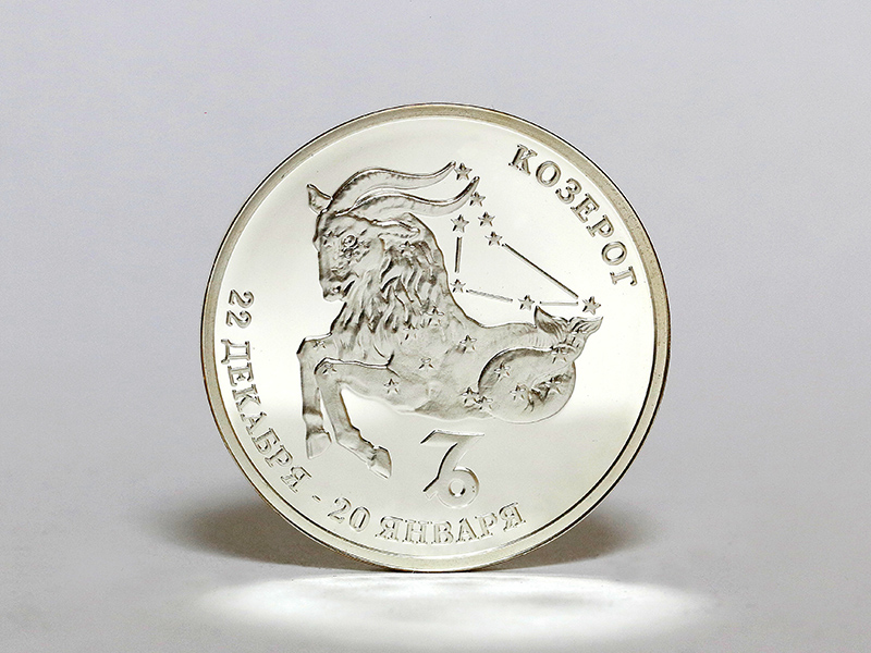 в центре – стилизованное изображение знака зодиака «Козерог». По кругу – надписи: внизу – «22 ДЕКАБРЯ – 20 ЯНВАРЯ», вверху – «КОЗЕРОГ».