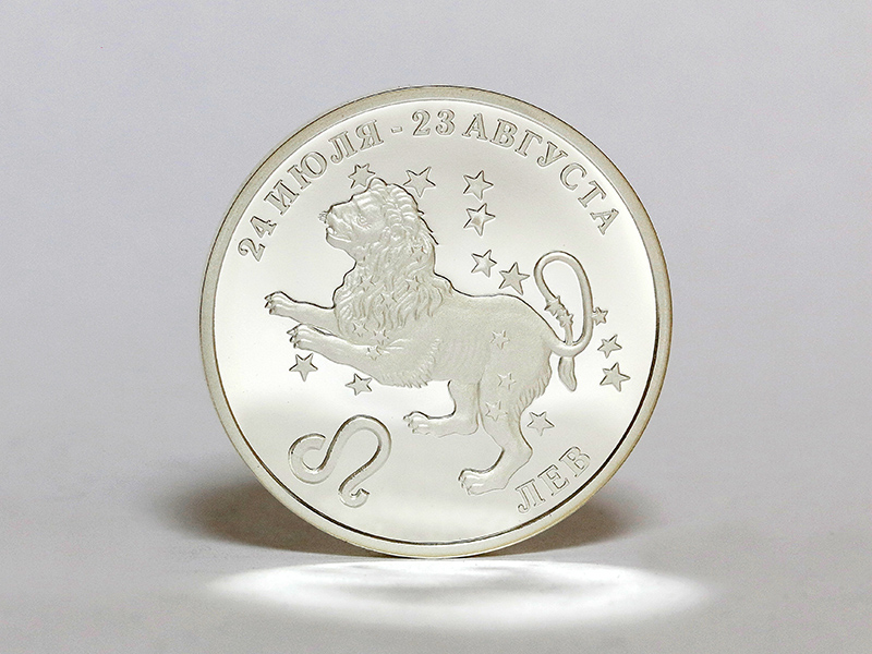 в центре – стилизованное изображение знака зодиака «Лев». По кругу – надписи: вверху – «24 ИЮЛЯ – 23 АВГУСТА», внизу – «ЛЕВ».