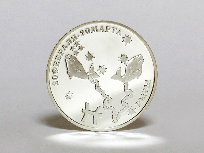 в центре – стилизованное изображение знака зодиака «Рыбы». По кругу – надписи: вверху – «20 ФЕВРАЛЯ – 20 МАРТА», внизу – «РЫБЫ».