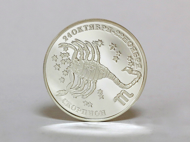 в центре – стилизованное изображение знака зодиака «Скорпион». По кругу – надписи: вверху – «24 ОКТЯБРЯ – 22 НОЯБРЯ», внизу – «СКОРПИОН».