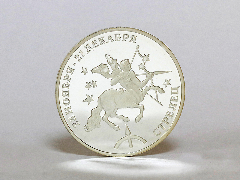 в центре – стилизованное изображение знака зодиака «Стрелец». По кругу – надписи: вверху – «23 НОЯБРЯ – 21 ДЕКАБРЯ», внизу – «СТРЕЛЕЦ».