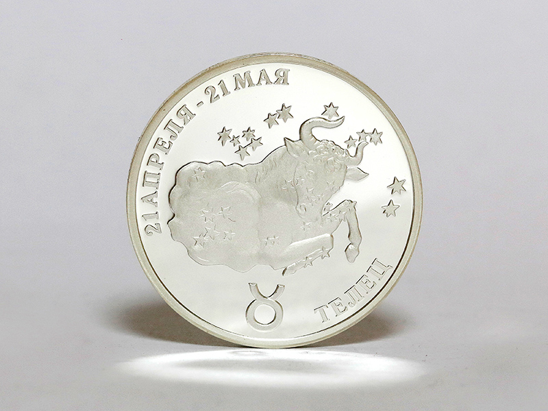 в центре – стилизованное изображение знака зодиака «Телец». По кругу – надписи: вверху – «21 АПРЕЛЯ – 21 МАЯ», внизу – «ТЕЛЕЦ».