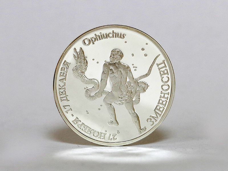 в центре – стилизованное изображение знака зодиака «Змееносец». По кругу – надписи: По кругу – надписи: вверху – «Ophiuchus», справа – «ЗМЕЕНОСЕЦ», слева – «27 НОЯБРЯ – 17 ДЕКАБРЯ».