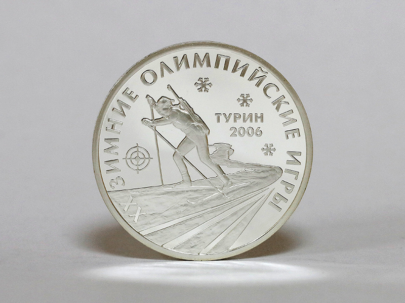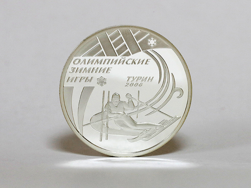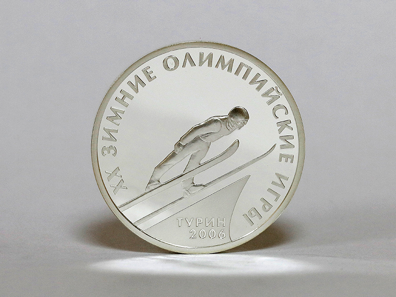 в центре – изображение летящего с трамплина лыжника; внизу – надпись: «ТУРИН 2006»; вверху по кругу – надпись: «XX ЗИМНИЕ ОЛИМПИЙСКИЕ ИГРЫ».