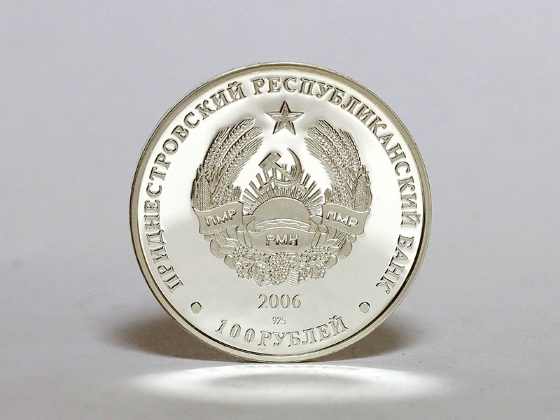 в центре – изображение Государственного герба Приднестровской Молдавской Республики; по кругу – надписи: вверху – «ПРИДНЕСТРОВСКИЙ РЕСПУБЛИКАНСКИЙ БАНК», внизу – «100 РУБЛЕЙ»; в нижней части под гербом – год выпуска монеты «2006», ниже – проба сплава.