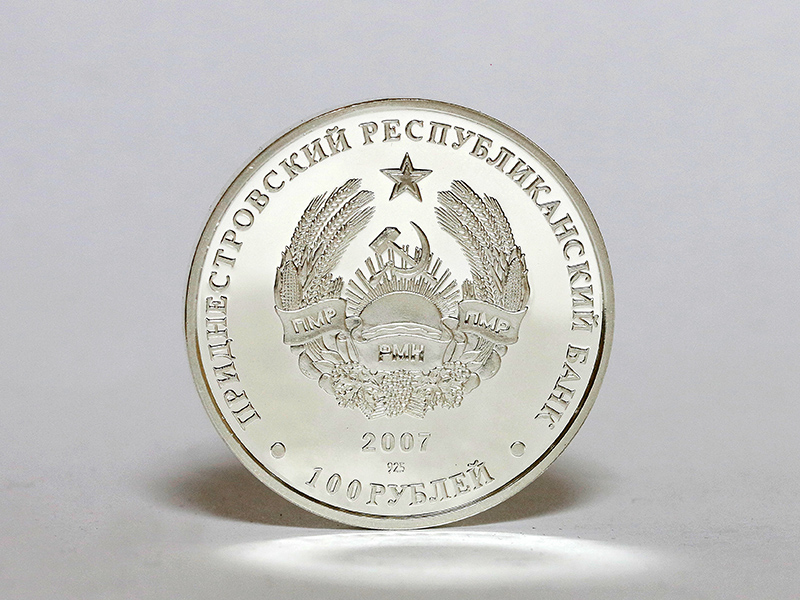 в центре – изображение Государственного герба Приднестровской Молдавской Республики; по кругу – надписи: вверху – «ПРИДНЕСТРОВСКИЙ РЕСПУБЛИКАНСКИЙ БАНК», внизу – «100 РУБЛЕЙ»; в нижней части под гербом – год выпуска монеты «2007», ниже – проба сплава.