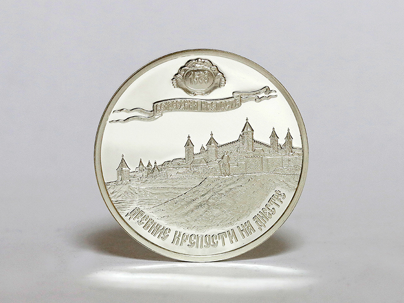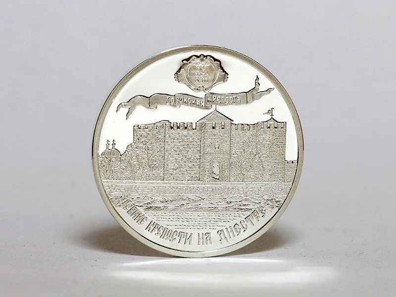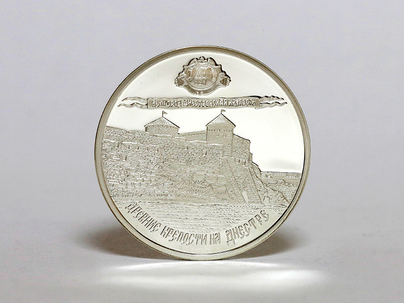 в центре – изображение Белгород-Днестровской крепости; вверху – стилизованная розетка, внутри которой указано время основания крепости: «XV ВЕК», ниже – стилизованная лента с надписью: «БЕЛГОРОД-ДНЕСТРОВСКАЯ КРЕПОСТЬ»; внизу по кругу – надпись: «ДРЕВНИЕ КРЕПОСТИ НА ДНЕСТРЕ».