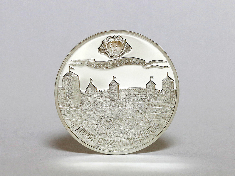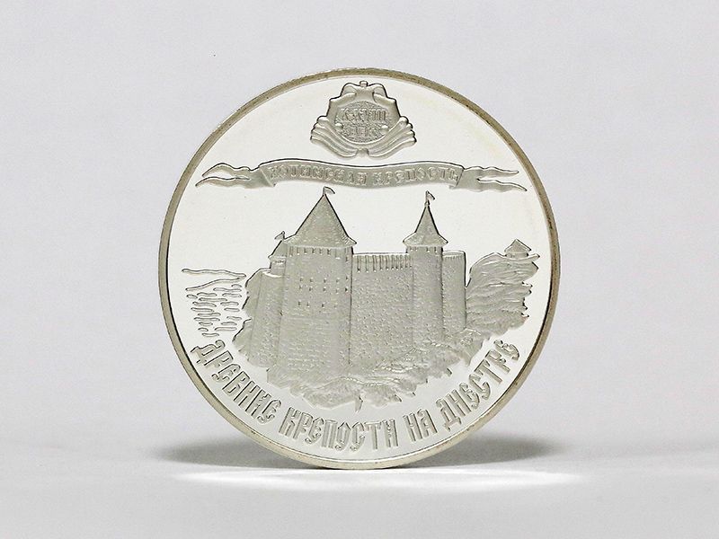 в центре – изображение Каменец-Подольской крепости; вверху – стилизованная розетка, внутри которой указан период основания крепости: «XIV ВЕК», ниже – стилизованная лента с надписью: «КАМЕНЕЦ-ПОДОЛЬСКАЯ КРЕПОСТЬ»; внизу по кругу – надпись: «ДРЕВНИЕ КРЕПОСТИ НА ДНЕСТРЕ».