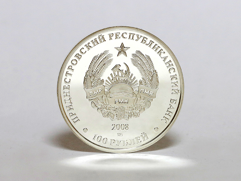 в центре – изображение Государственного герба Приднестровской Молдавской Республики; по кругу – надписи: вверху – «ПРИДНЕСТРОВСКИЙ РЕСПУБЛИКАНСКИЙ БАНК», внизу – «100 РУБЛЕЙ»; в нижней части под гербом – год выпуска монеты «2008», ниже – проба сплава.