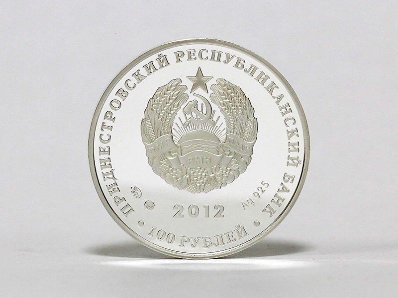 в центре – изображение Государственного герба Приднестровской Молдавской Республики; по кругу – надписи: вверху – «ПРИДНЕСТРОВСКИЙ РЕСПУБЛИКАНСКИЙ БАНК», внизу – «100 РУБЛЕЙ»; в нижней части под гербом – год выпуска монеты «2012», слева – логотип изготовителя, государственное пробирное клеймо, справа – обозначение металла, проба сплава.