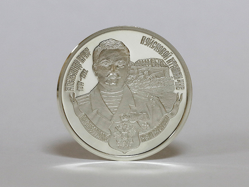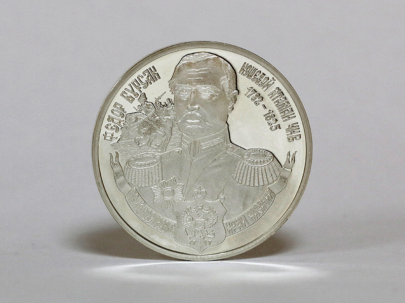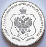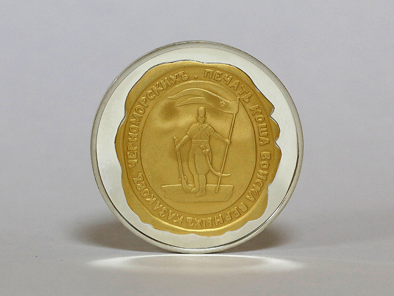 в центре – крупным планом портрет кошевого атамана ЧКВ Фёдора Бурсака в военном мундире на фоне панорамы сражения. Вверху по кругу – надписи: слева – «ФЕДОР БУРСАК», справа – «КОШЕВОЙ АТАМАН ЧКВ», ниже – «1782-1825». Внизу по кругу, слева направо – надписи на стилизованной ленте: «ПРИДНЕСТРОВЬЕ», «КРАЙ КАЗАЧИЙ», между ними посередине – изображение герба Черноморского казачьего войска с годом образования – «1787».