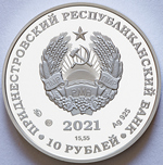 в центре – изображение Государственного герба Приднестровской Молдавской Республики; по кругу – надписи: вверху – «ПРИДНЕСТРОВСКИЙ РЕСПУБЛИКАНСКИЙ БАНК», внизу – «10 РУБЛЕЙ»; в нижней части под гербом – год выпуска монеты «2021», ниже – содержание химически чистого металла в граммах, слева – логотип изготовителя, государственное пробирное клеймо, справа – обозначение металла, проба сплава.