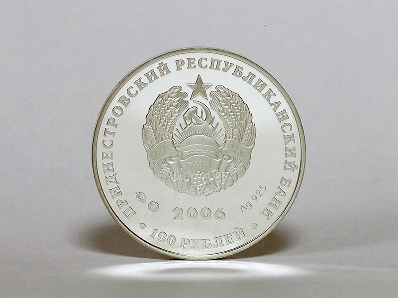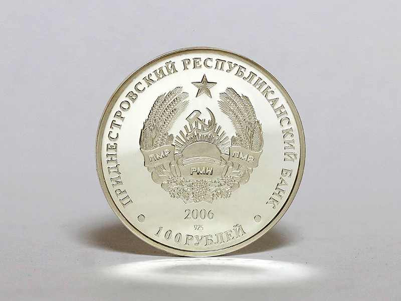 в центре – изображение Государственного герба Приднестровской Молдавской Республики; по кругу – надписи: вверху – «ПРИДНЕСТРОВСКИЙ РЕСПУБЛИКАНСКИЙ БАНК», внизу – «100 РУБЛЕЙ»; в нижней части под гербом – год выпуска монеты «2006», слева – логотип изготовителя, государственное пробирное клеймо, справа – обозначение металла, проба сплава.