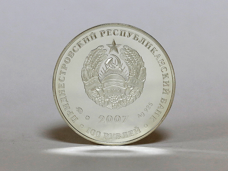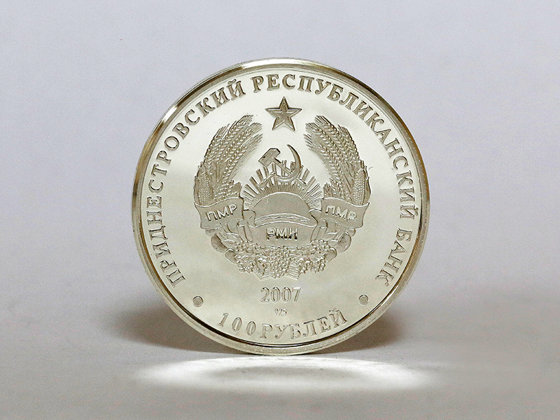 в центре – изображение Государственного герба Приднестровской Молдавской Республики; по кругу – надписи: вверху – «ПРИДНЕСТРОВСКИЙ РЕСПУБЛИКАНСКИЙ БАНК», внизу – «100 РУБЛЕЙ»; в нижней части под гербом – год выпуска монеты «2007», слева – логотип изготовителя, государственное пробирное клеймо, справа – обозначение металла, проба сплава.