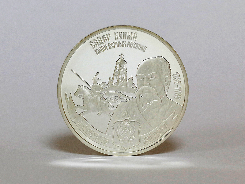 в центре – крупным планом портрет кошевого атамана Сидора Белого на фоне скачущего на коне казака с копьём в руке и сторожевой вышки, за портретом справа – годы жизни: «1735-1788». Вверху – надписи: «СИДОР БЕЛЫЙ», ниже – «КОША БЕЛЫХ КАЗАКОВ»; внизу по кругу, слева направо – надписи на стилизованной ленте: «ПРИДНЕСТРОВЬЕ», «КРАЙ КАЗАЧИЙ», между ними посередине – изображение герба Черноморского казачьего войска с годом образования – «1787».