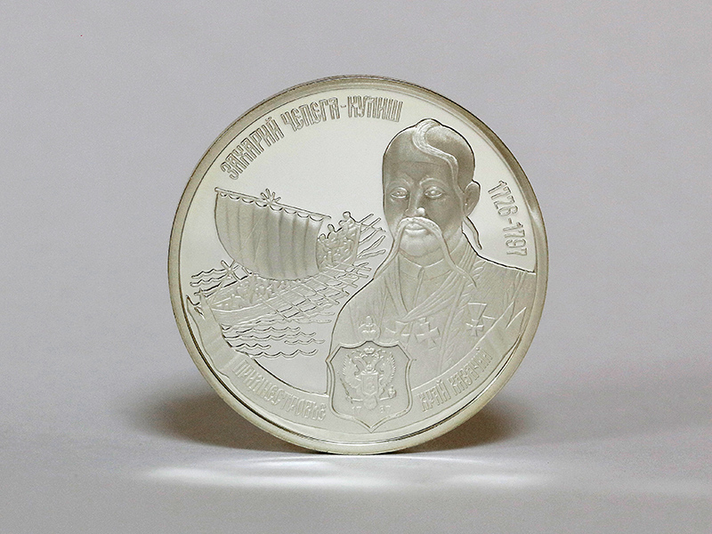 в центре – крупным планом портрет кошевого атамана войска «Верных казаков» Захария Чепеги-Кулиша на фоне парусной лодки с гребцами, за портретом справа – годы жизни: «1726-1797». Вверху – надпись: «ЗАХАРИЙ ЧЕПЕГА-КУЛИШ»; внизу по кругу, слева направо – надписи на стилизованной ленте: «ПРИДНЕСТРОВЬЕ», «КРАЙ КАЗАЧИЙ», между ними посередине – изображение герба Черноморского казачьего войска с годом образования – «1787».