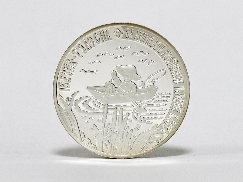 в центре – стилизованное изображение главного героя украинской народной сказки Ивасика-Телесика, плывущего в челноке со связкой пойманной рыбы на фоне камышей. По кругу вверху – надписи: слева – «IВАСИК-ТЕЛЕСИК», справа на стилизованной ленте – «ЗА МОТИВАМИ УКРАIНСЬКИХ НАРОДНИХ КАЗОК».