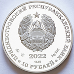 в центре – изображение Государственного герба Приднестровской Молдавской Республики; по кругу – надписи: вверху – «ПРИДНЕСТРОВСКИЙ РЕСПУБЛИКАНСКИЙ БАНК», внизу – «10 РУБЛЕЙ»; в нижней части под гербом – год выпуска монеты «2022», ниже – содержание химически чистого металла в граммах, слева – логотип изготовителя, государственное пробирное клеймо, справа – обозначение металла, проба сплава.