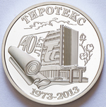 в центре – крупным планом изображение здания ЗАО «Тиротекс», опоясанное лентой ткани с надписью «40 ЛЕТ», справа от здания – ветка хлопчатника, вверху – надпись «ТИРОТЕКС», внизу – надпись «1973-2013».