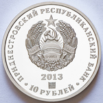 в центре – изображение государственного герба Приднестровской Молдавской Республики; по кругу надписи: вверху – «ПРИДНЕСТРОВСКИЙ РЕСПУБЛИКАНСКИЙ БАНК», внизу «10 РУБЛЕЙ»; в нижней части под гербом – год выпуска монеты «2013», ниже – логотип изготовителя, государственное пробирное клеймо, обозначение металла, проба сплава, масса.