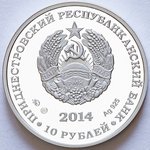 в центре – изображение государственного герба Приднестровской Молдавской Республики; по кругу надписи: вверху – «ПРИДНЕСТРОВСКИЙ РЕСПУБЛИКАНСКИЙ БАНК», внизу «10 РУБЛЕЙ»; в нижней части под гербом – год выпуска монеты «2014», ниже – логотип изготовителя, государственное пробирное клеймо, обозначение металла, проба сплава.