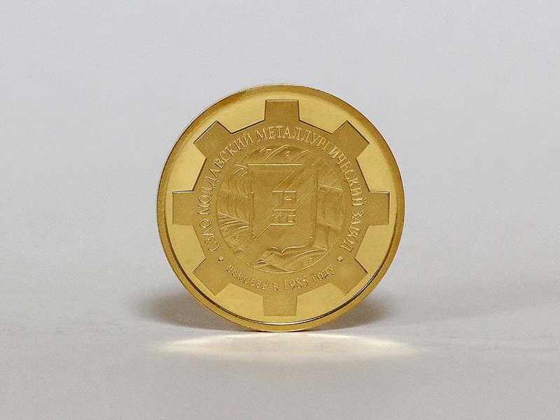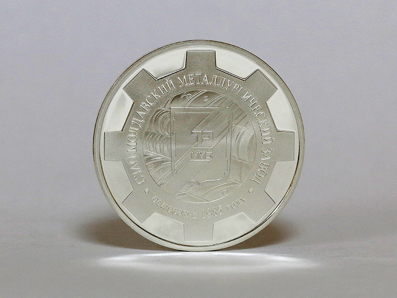 монета стилизована под шестерню, на центральном плане – изображение логотипа СЗАО «Молдавский металлургический завод» на фоне выпускаемой продукции. По кругу – надписи: «СЗАО МОЛДАВСКИЙ МЕТАЛЛУРГИЧЕСКИЙ ЗАВОД», ниже – «основан в 1985 году».