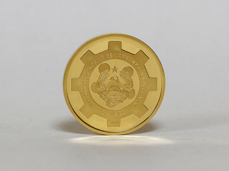 монета стилизована под шестерню, в центре – изображение Государственного герба Приднестровской Молдавской Республики. По кругу – надписи: вверху – «ПРИДНЕСТРОВСКИЙ РЕСПУБЛИКАНСКИЙ БАНК», внизу – «3 РУБЛЯ». В нижней части – год выпуска монеты «2008».