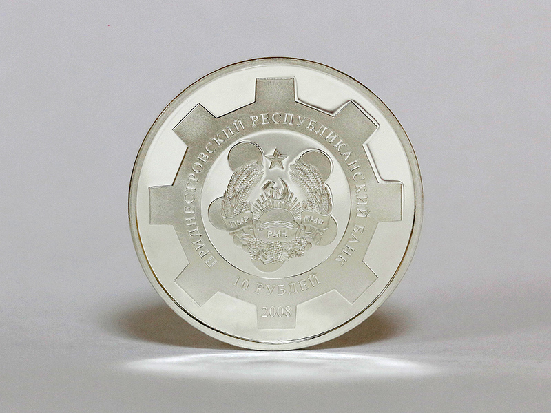 монета стилизована под шестерню, в центре – изображение Государственного герба Приднестровской Молдавской Республики. По кругу – надписи: вверху – «ПРИДНЕСТРОВСКИЙ РЕСПУБЛИКАНСКИЙ БАНК», внизу – «10 РУБЛЕЙ». В нижней части – год выпуска монеты «2008».