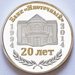 в центре – изображение здания банка «Ипотечный», над ним – надпись в позолоте «Банк «Ипотечный»; слева – «1994», справа – «2014»; внизу – надпись в позолоте «20 лет», под ней – две лавровые ветви.