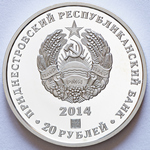 в центре – изображение Государственного герба Приднестровской Молдавской Республики; по кругу – надписи: вверху – «ПРИДНЕСТРОВСКИЙ РЕСПУБЛИКАНСКИЙ БАНК», внизу – «20 РУБЛЕЙ»; в нижней части под гербом – год выпуска монеты «2014», ниже – логотип изготовителя, государственное пробирное клеймо, обозначение металла, проба сплава, содержание химически чистого металла в граммах.