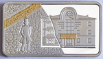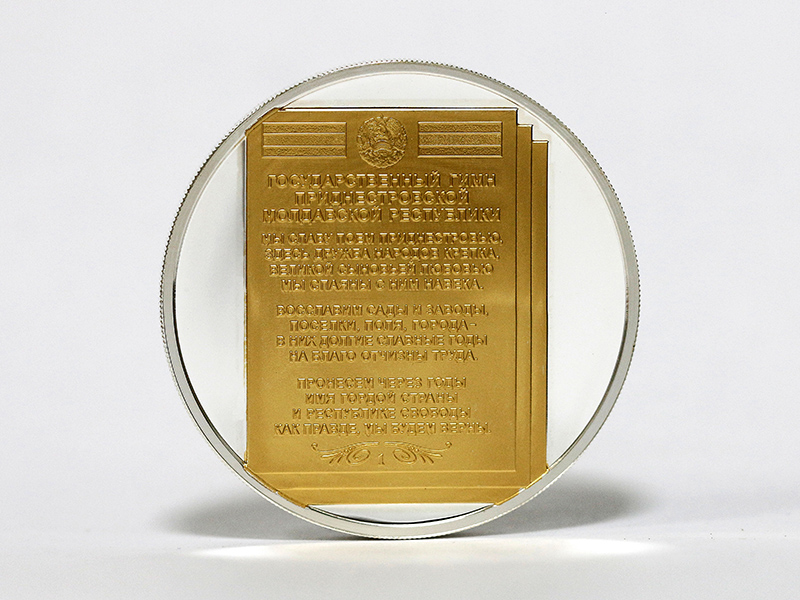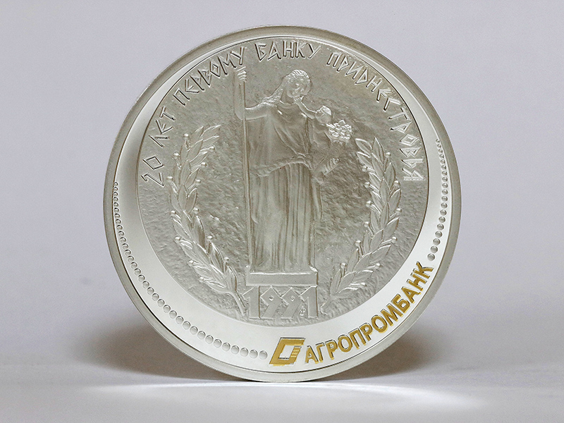 внутри современной монеты выдавлена стилизованная под древность другая монета с изображением статуи древнегреческой богини мира с сыном, внизу под статуей – надпись: «1991». Вверху по кругу – надпись: «20 ЛЕТ ПЕРВОМУ БАНКУ ПРИДНЕСТРОВЬЯ». Внизу современной монеты – логотип банка, выполненный в позолоте, слева по кругу – надпись в позолоте: «АГРОПРОМБАНК».