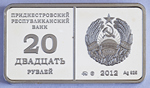 в центре – полоса, разделяющая монету на две равные части. В правой части – изображение Государственного герба Приднестровской Молдавской Республики; в нижней части под гербом надписи: по центру – год «2012», слева – логотип изготовителя, государственное пробирное клеймо, справа – обозначение металла, проба сплава. В левой части – надписи: вверху – «ПРИДНЕСТРОВСКИЙ РЕСПУБЛИКАНСКИЙ БАНК», в центре – цифра «20», внизу – прописью «ДВАДЦАТЬ РУБЛЕЙ».