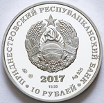 в центре – изображение Государственного герба Приднестровской Молдавской Республики; по кругу – надписи: вверху – «ПРИДНЕСТРОВСКИЙ РЕСПУБЛИКАНСКИЙ БАНК», внизу – «10 РУБЛЕЙ»; в нижней части под гербом – год выпуска монеты «2017», ниже – содержание химически чистого металла в граммах, слева – логотип изготовителя, государственное пробирное клеймо, справа – обозначение металла, проба сплава.