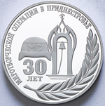 справа – стилизованное изображение архитектурного сооружения – Арки Мира «Блаженны миротворцы», слева – каска военнослужащего миротворческих сил, под ней – надпись «30 ЛЕТ», вверху по кругу – надпись: «МИРОТВОРЧЕСКОЙ ОПЕРАЦИИ В ПРИДНЕСТРОВЬЕ».