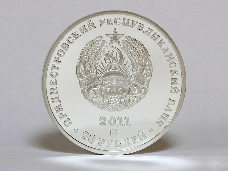 в центре – изображение Государственного герба Приднестровской Молдавской Республики; по кругу – надписи: вверху – «ПРИДНЕСТРОВСКИЙ РЕСПУБЛИКАНСКИЙ БАНК», внизу – «20 РУБЛЕЙ»; в нижней части под гербом – год выпуска монеты «2011», ниже – логотип изготовителя, государственное пробирное клеймо, обозначение металла, проба сплава, содержание химически чистого металла в граммах.