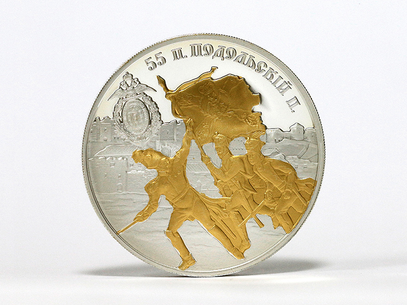 в центре – крупным планом стилизованное изображение фрагмента атаки; фигуры солдат, офицера и флаг выполнены в позолоте. Вверху по кругу – надпись: «55 П. ПОДОЛЬСКИЙ П.».