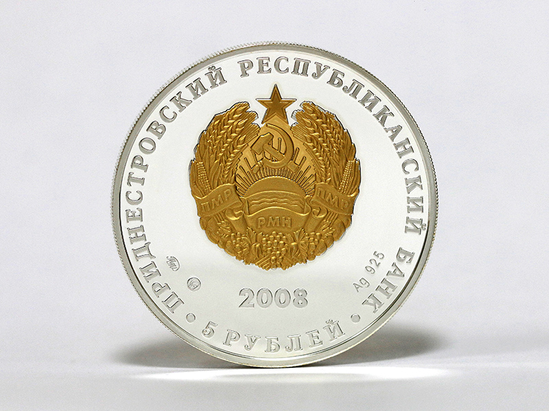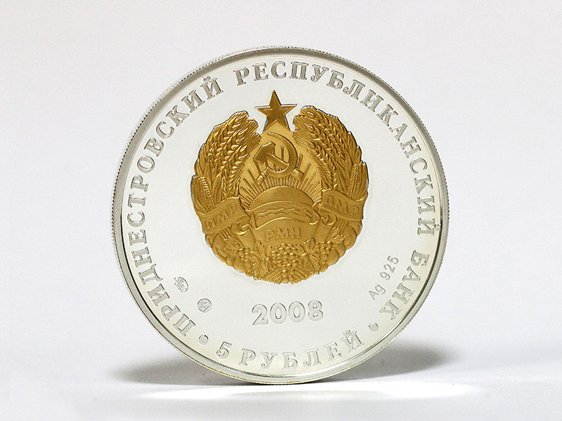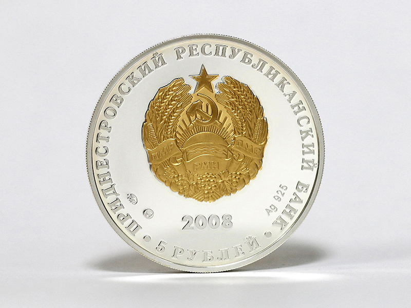 в центре – изображение Государственного герба Приднестровской Молдавской Республики, выполненное в позолоте; по кругу – надписи: вверху – «ПРИДНЕСТРОВСКИЙ РЕСПУБЛИКАНСКИЙ БАНК», внизу – «5 РУБЛЕЙ»; в нижней части под гербом – год выпуска монеты «2008», слева – логотип изготовителя, государственное пробирное клеймо, справа – обозначение металла, проба сплава.