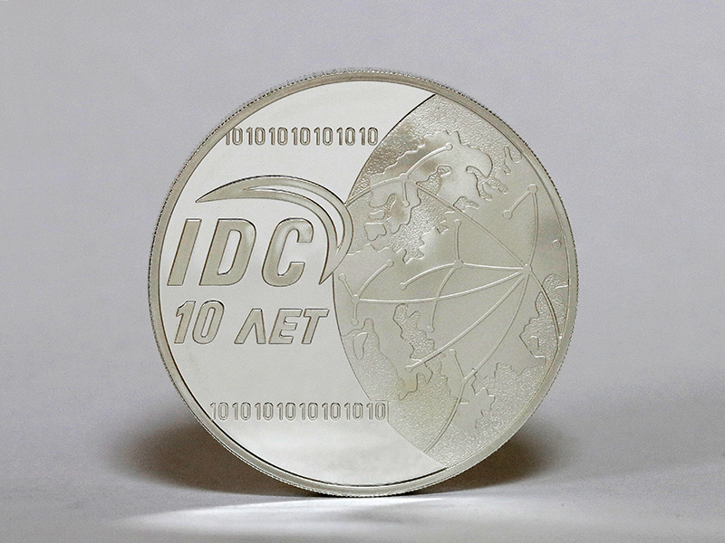 справа – крупным планом изображение земного шара с сетью абонентов IDC, слева – надпись: «IDC 10 лет». Вверху и внизу надписи – полосовой элемент в виде повторяющегося числа «10».