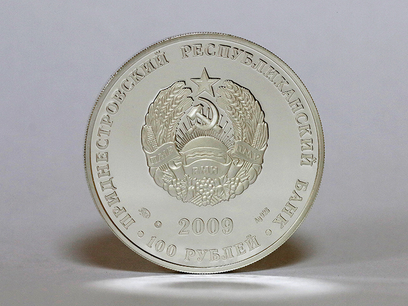 в центре – изображение Государственного герба Приднестровской Молдавской Республики; по кругу – надписи: вверху – «ПРИДНЕСТРОВСКИЙ РЕСПУБЛИКАНСКИЙ БАНК», внизу – «100 РУБЛЕЙ»; в нижней части под гербом – год выпуска монеты «2009», слева – логотип изготовителя, государственное пробирное клеймо, справа – обозначение металла, проба сплава.