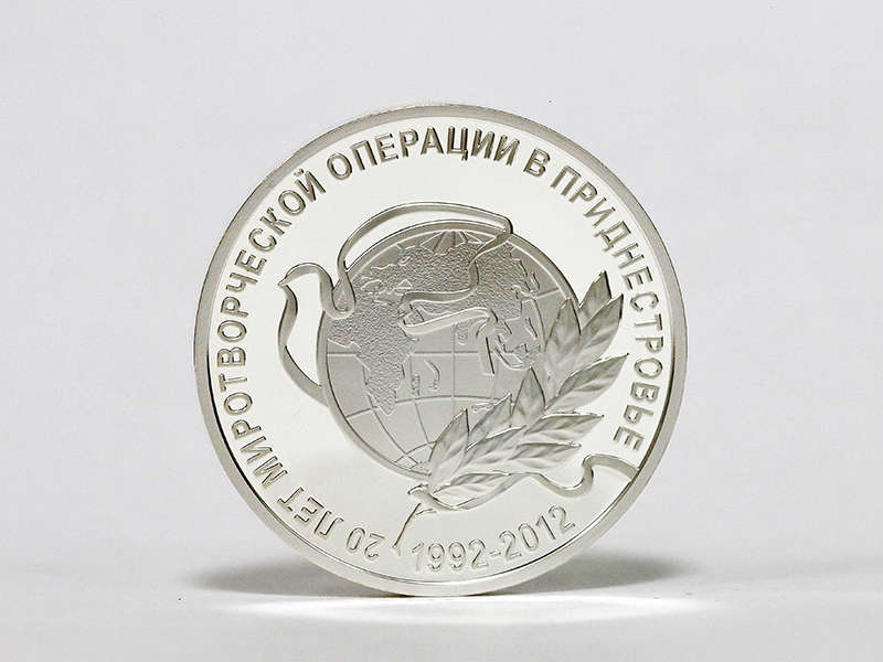 в центре – изображение голубя мира в виде ленты, опоясывающей земной шар и лавровую ветвь; по кругу – слева направо надпись: «20 ЛЕТ МИРОТВОРЧЕСКОЙ ОПЕРАЦИИ В ПРИДНЕСТРОВЬЕ», внизу – надпись: «1992-2012».