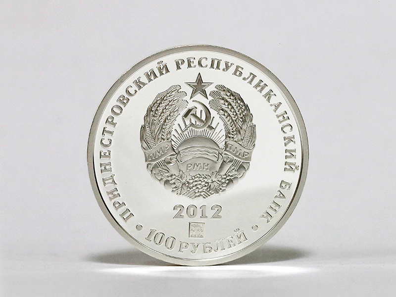 в центре – изображение Государственного герба Приднестровской Молдавской Республики; по кругу – надписи: вверху – «ПРИДНЕСТРОВСКИЙ РЕСПУБЛИКАНСКИЙ БАНК», внизу – «100 РУБЛЕЙ»; в нижней части под гербом – год выпуска монеты «2012», ниже – логотип изготовителя, государственное пробирное клеймо, обозначение металла, проба сплава, содержание химически чистого металла в граммах.