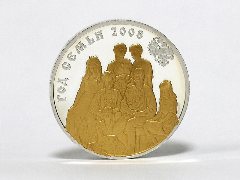 в центре – крупным планом стилизованное изображение царской семьи, выполненное в позолоте; вверху по кругу – надпись: «ГОД СЕМЬИ 2008».