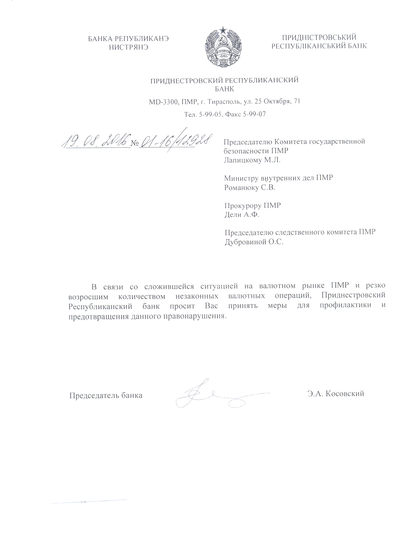 Для обеспечения нормального функционирования пунктов обмена валюты и защиты  жителей Приднестровья от валютных махинаторов, 19 августа.2016 г. Приднестровский республиканский банк направил письмо следующего содержания: “В связи со сложившейся ситуацией на валютном рынке ПМР и резко возросшим количеством незаконных валютных операций, Приднестровский Республиканский банк просит Вас принять меры для профилактики и предотвращения данного правонарушения» по адресам: КГБ, МВД, Прокурору ПМР, председателю следственного комитета ПМР.