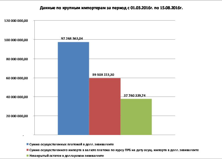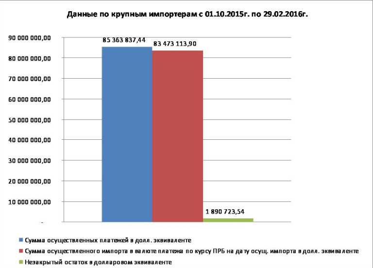 Для оптимизации валютных потоков и достижения стабилизации ситуации на валютном рынке правительство (по предложению ПРБ) выходило с инициативой об уменьшении сроков репатриации, однако данная мера не нашла поддержки у депутатского корпуса. Заметим, что срок репатриации для экспортёра электроэнергии составляет 60 дней. Таким образом, в результате подобных действий доля не полученных, но оплаченных крупным импортёром ООО «Шериф» товаров увеличилась с 3% до 61%, что в денежном выражении в долларовом эквиваленте составляет 22 958 933,93 долларов США. Интересно, что именно эта сумма составляет непокрытый спрос на безналичную валюту по состоянию на текущий момент. |